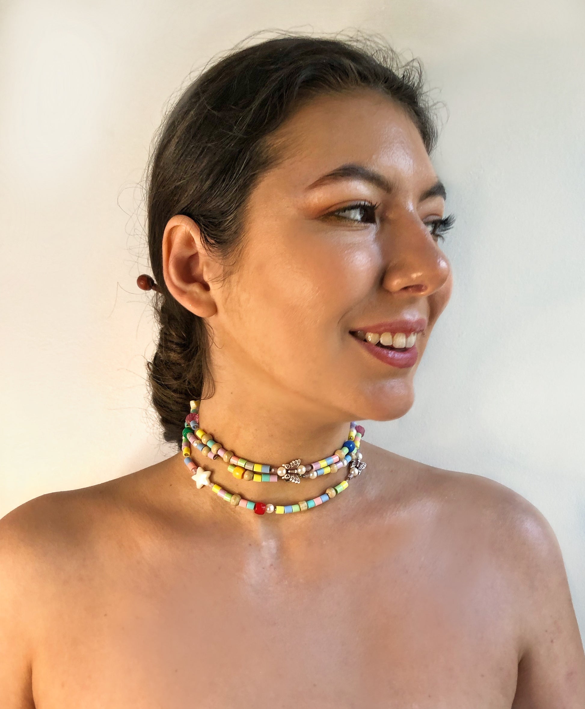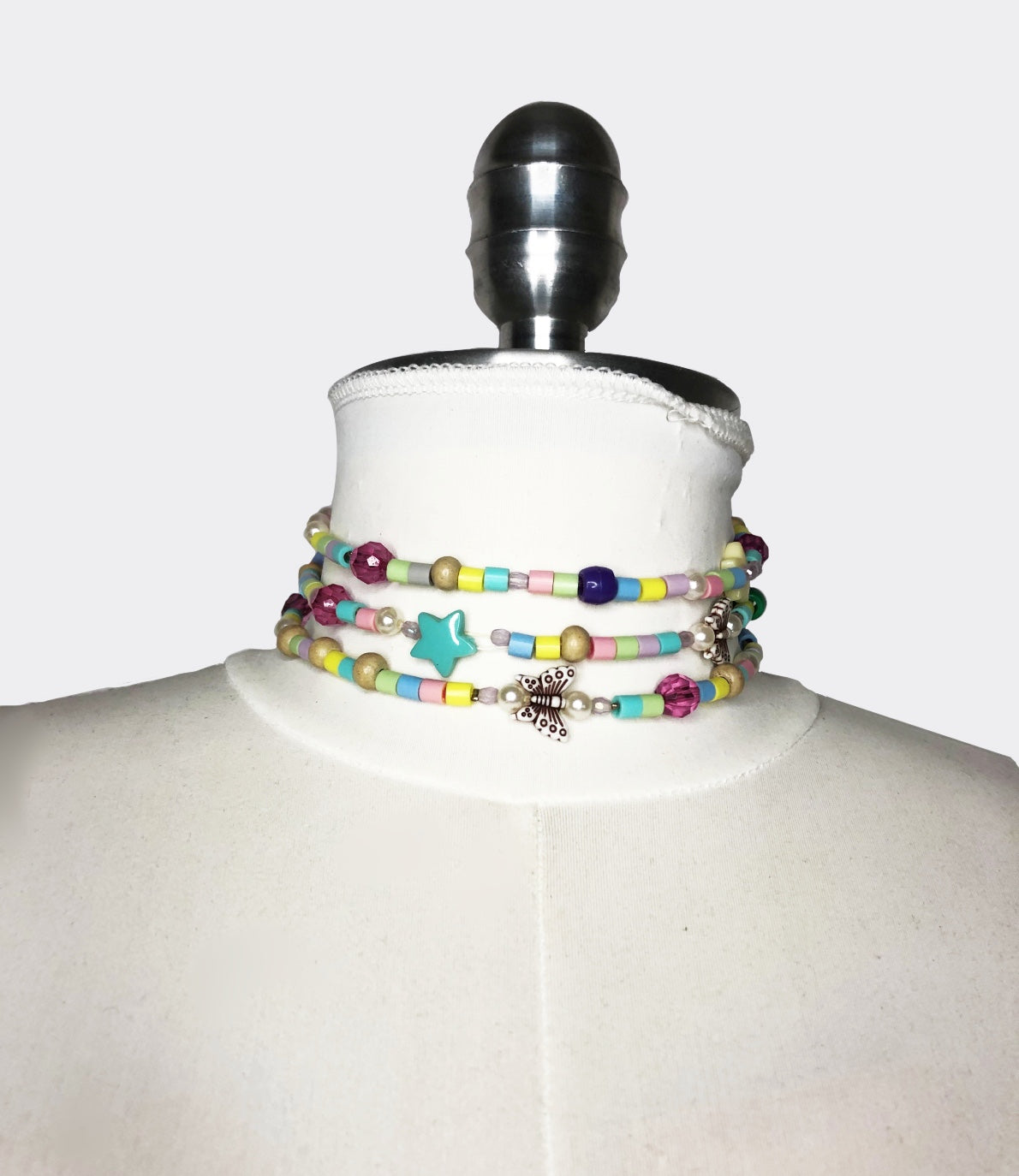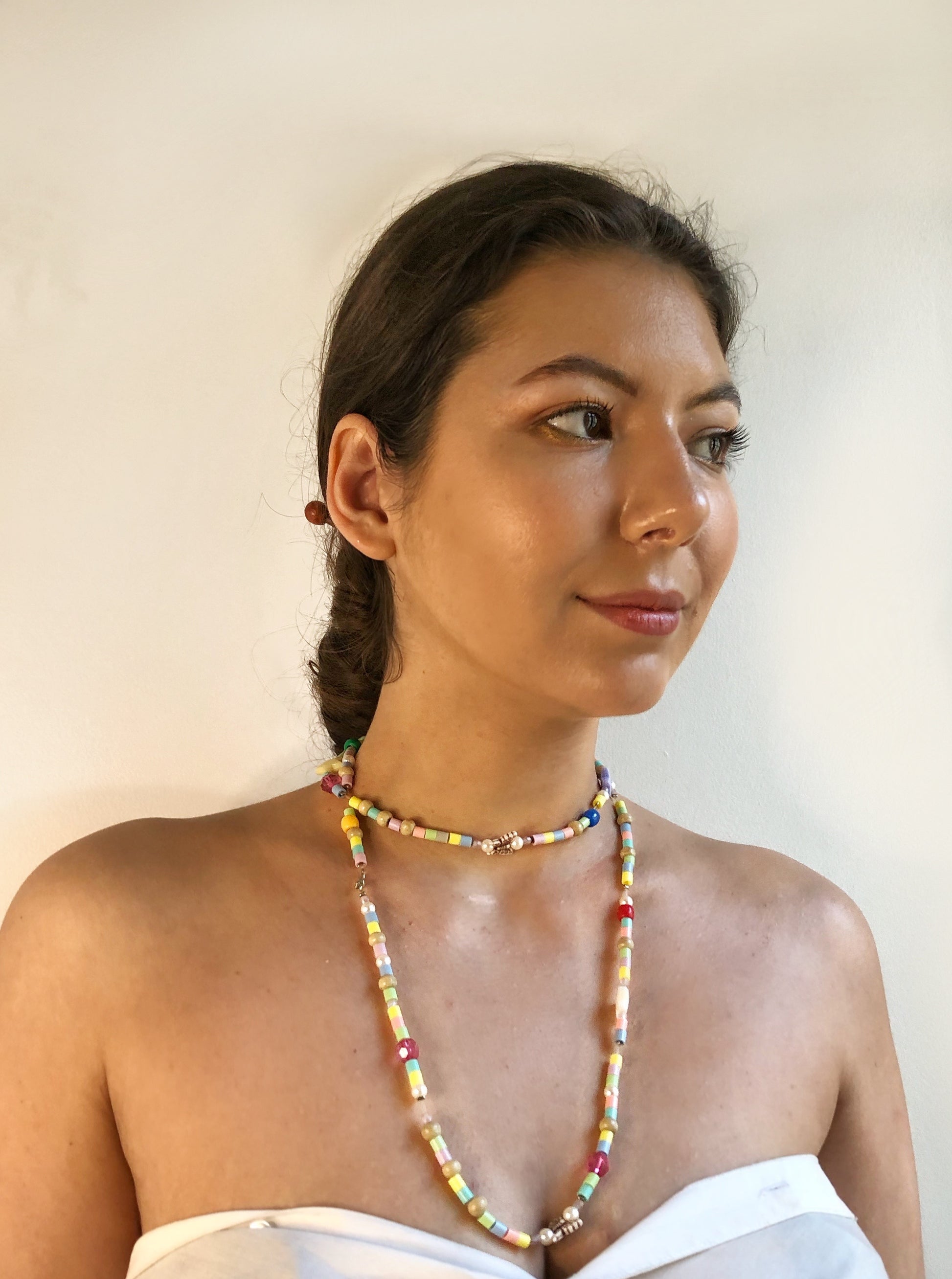 The Versatile Strand is a piece of jewellery that can be worn in many different ways: in a triple choker, single long stand, bracelet and many more.